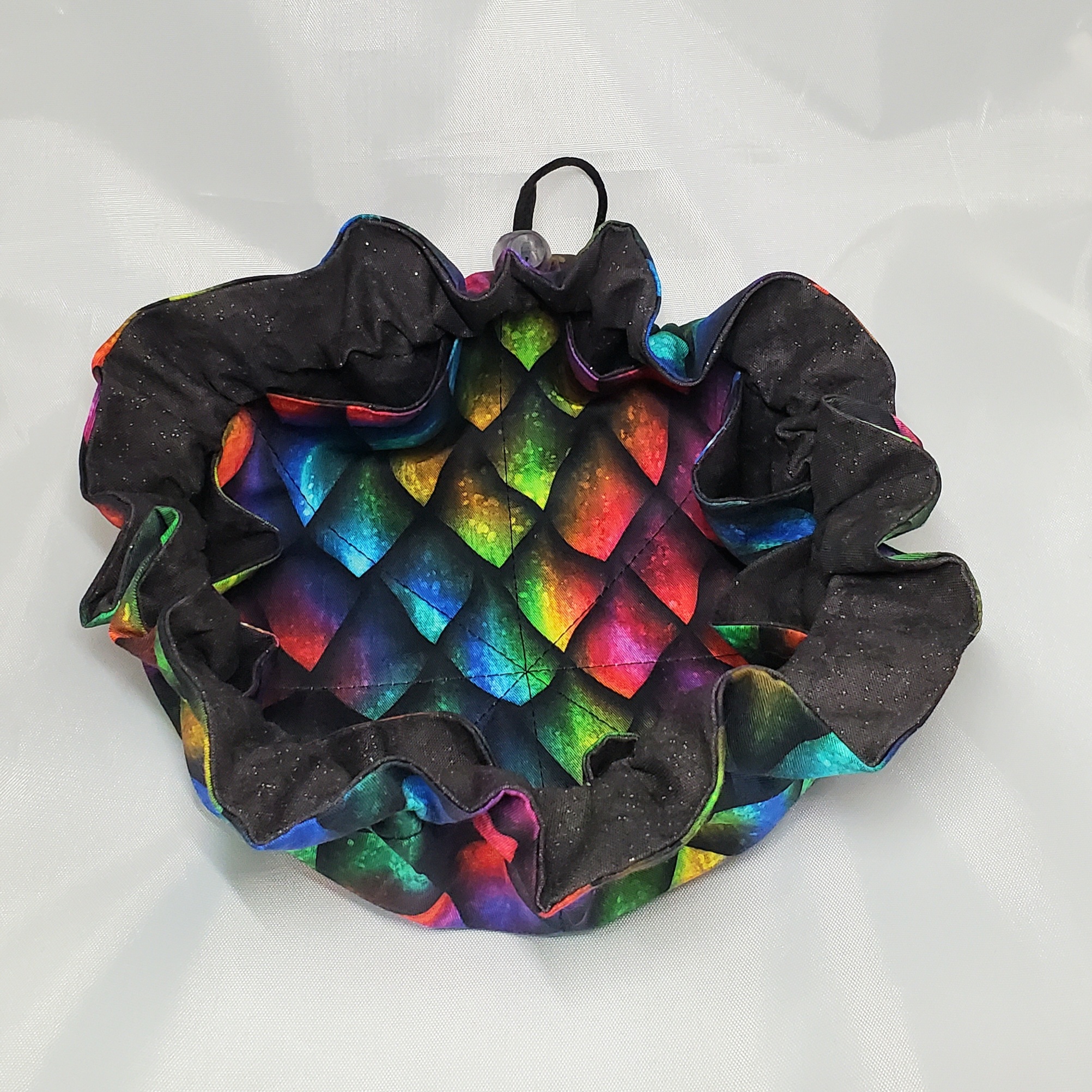 A drawstring dice pouch with 8 separate pockets to hold all your dice sets, gaming pieces and other paraphernalia. It is lightly lined for structure which also means you can use it as a small dice tray when opened up! A silky cord and matching cord lock cinches tight to keep the bag securely closed. Can also be used as a travel jewelry bag, or for gems and stones. Approximately 12 inches when opened flat. Available with a variety of prints; please select your preference from the drop down menu.