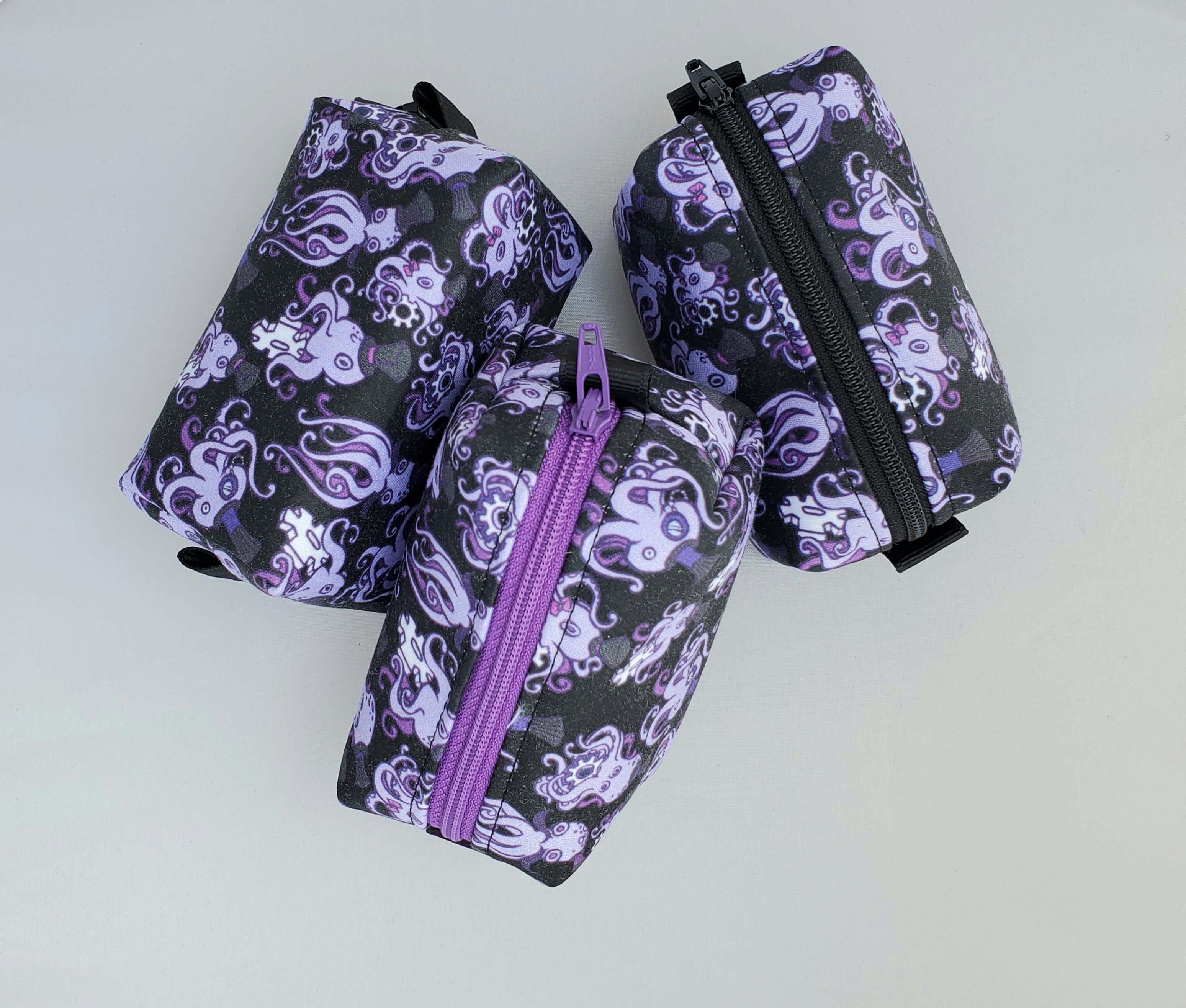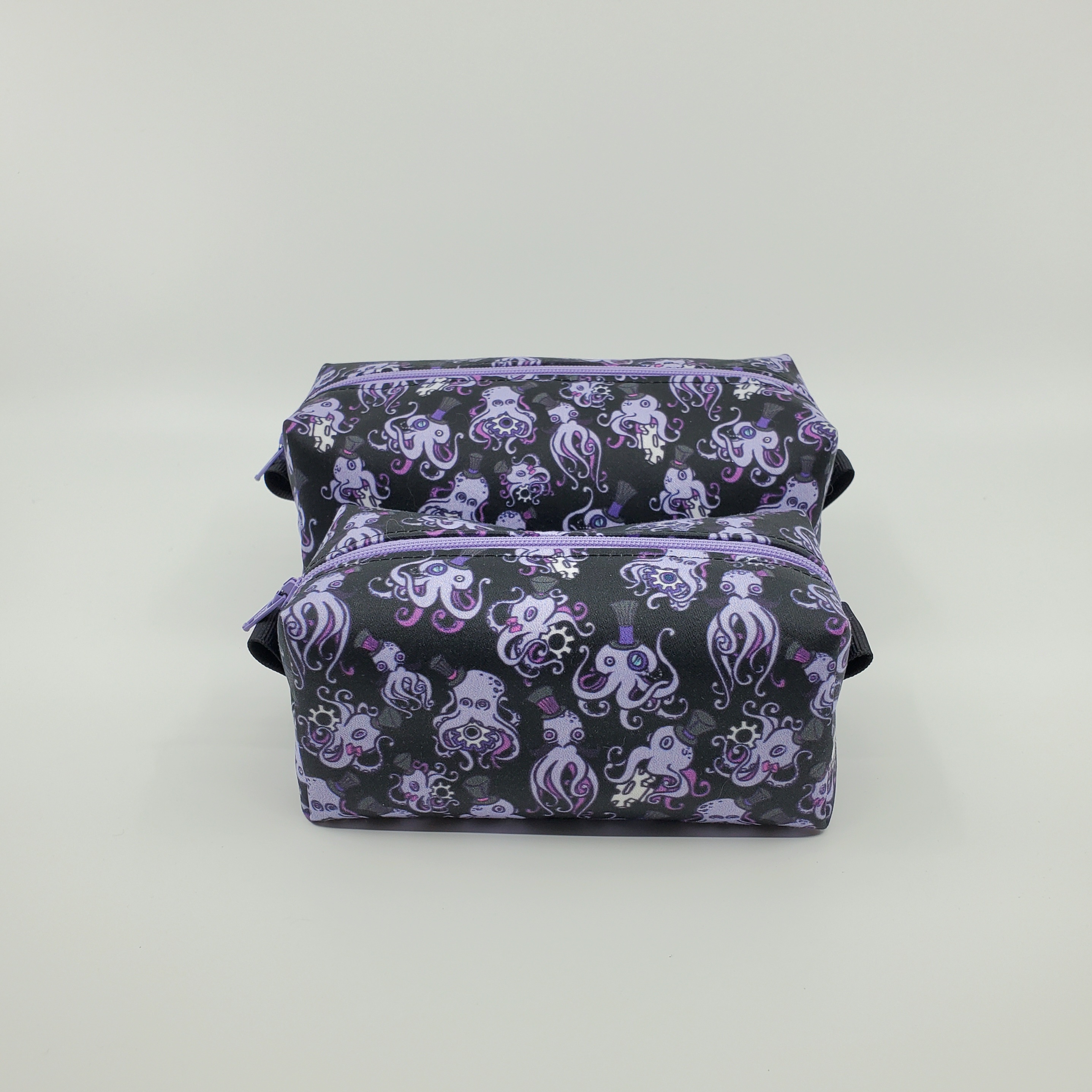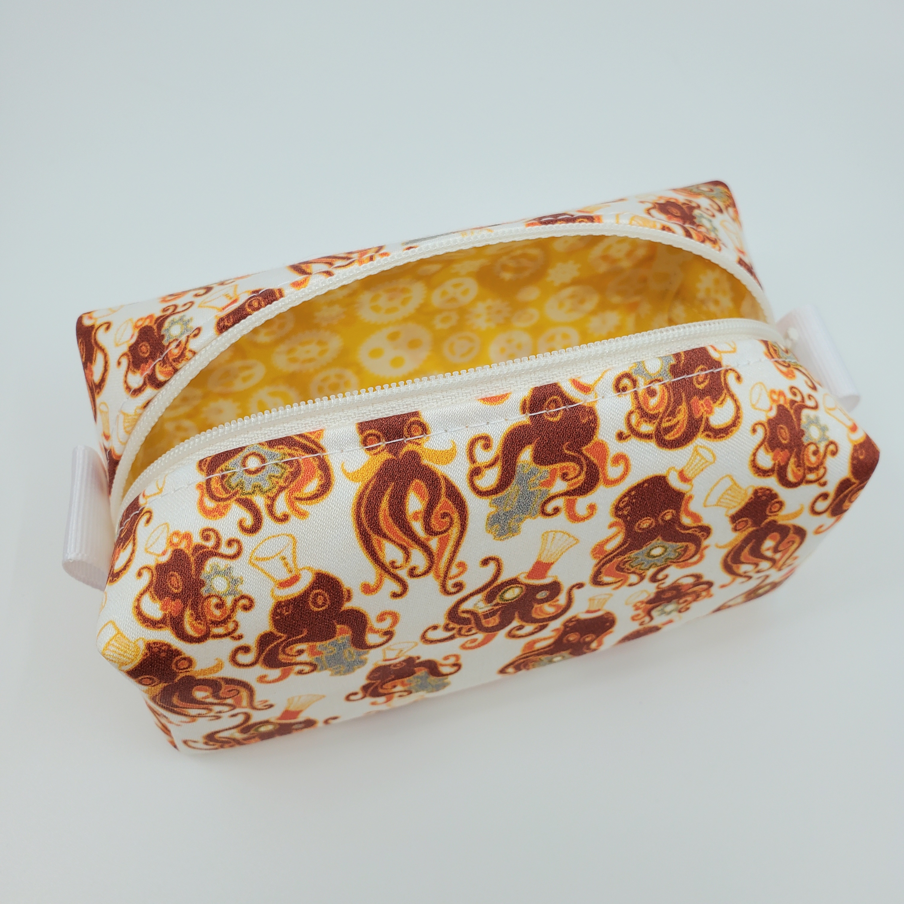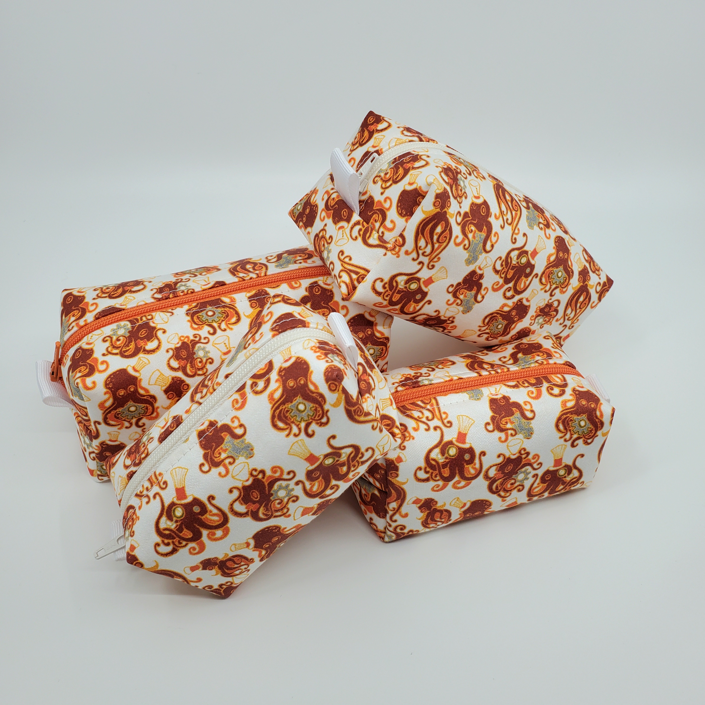 Top hats, monocles, and gears, oh my! These octopus boxbags have a splash of Victorian whimsy! Made with custom-printed organic cotton, and available in multiple sizes across 4 different color schemes! Select your size and color in the drop down menu.