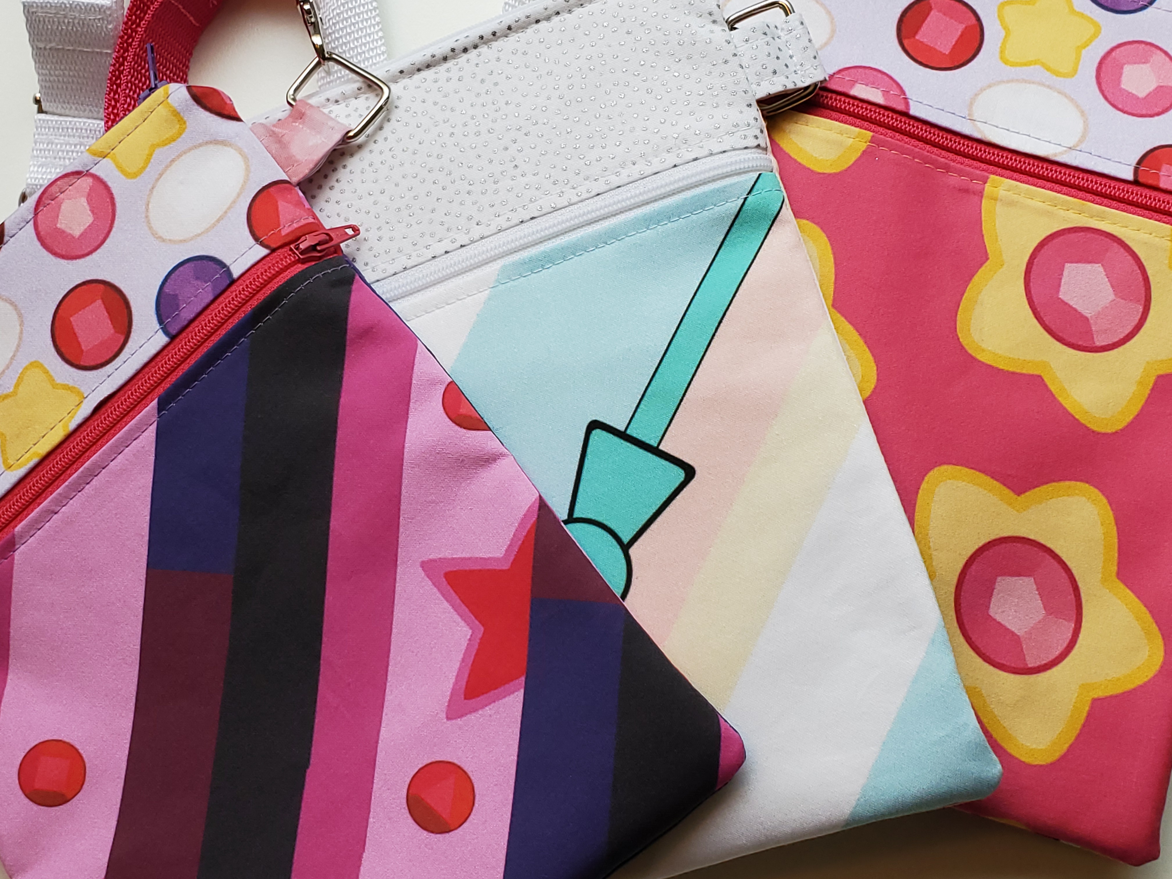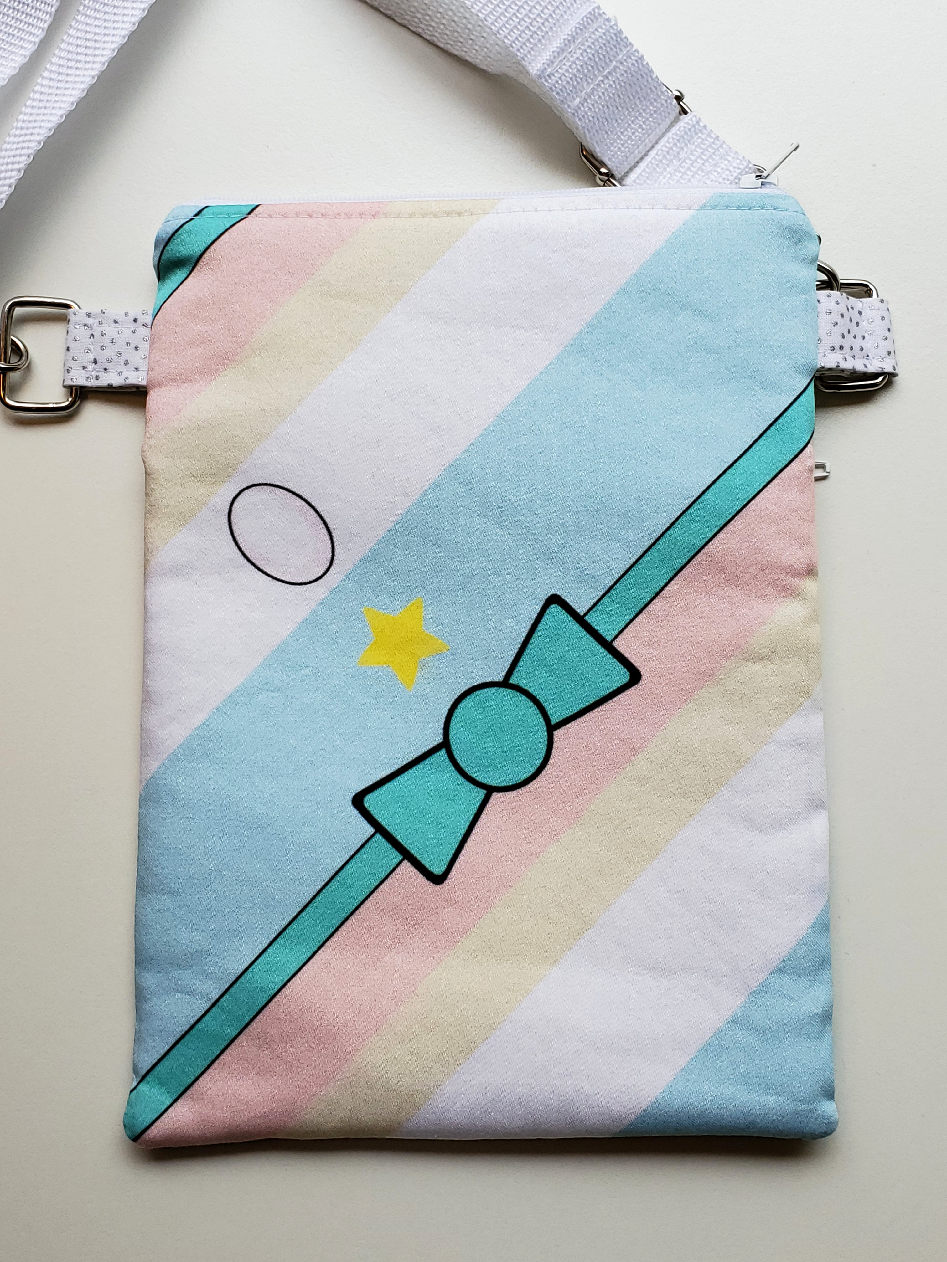 Shine all the time with a crossbody bag inspired by Steven Universe. Sized to be the perfect grab-n-go essentials bag! Measures 9.5"x6.5" with two zippered compartments. Adjustable strap expands to 60" and can also be swapped out via the swivel hook attachments. Fully lined. Available in multiple varieties; please select your preferred style from the drop down menu.