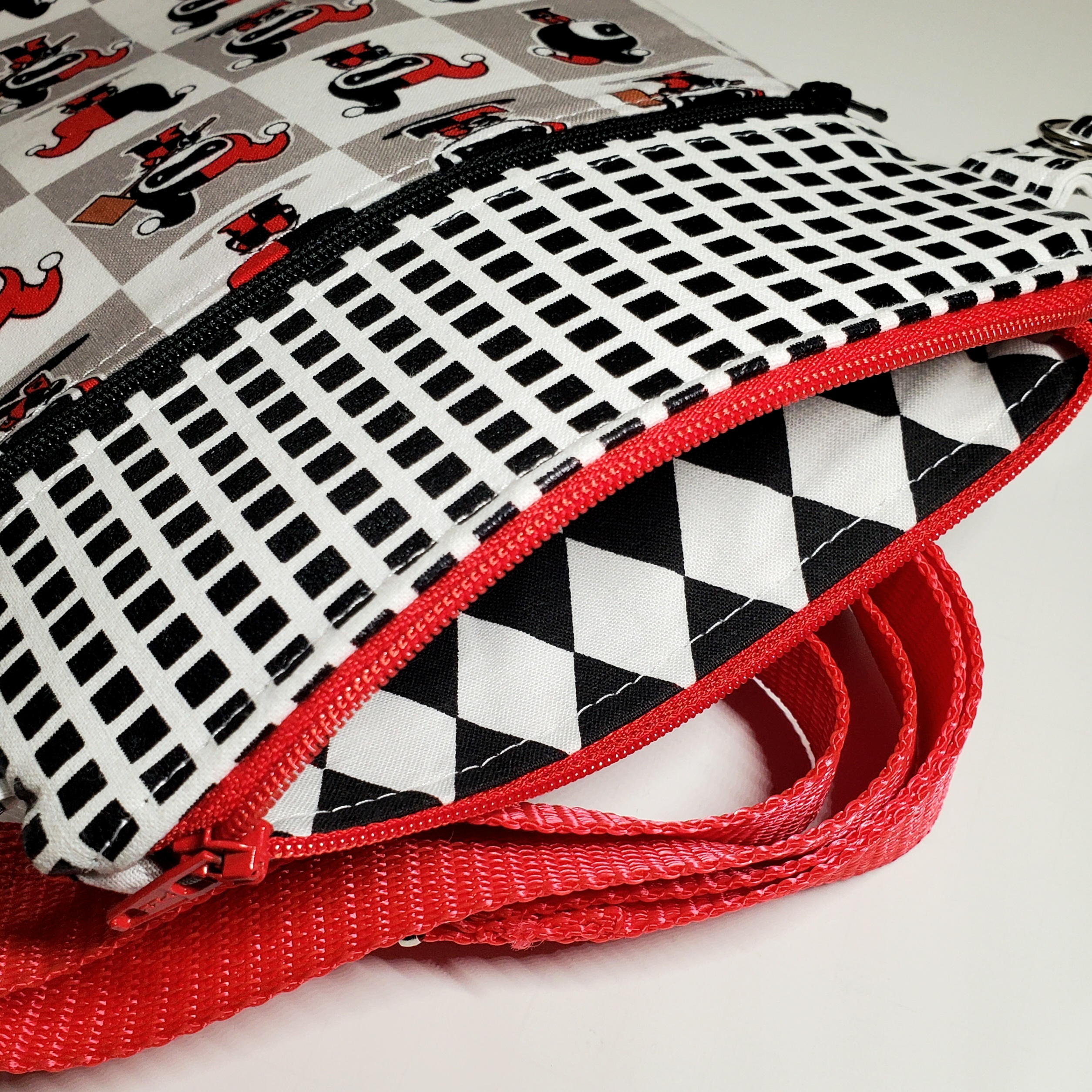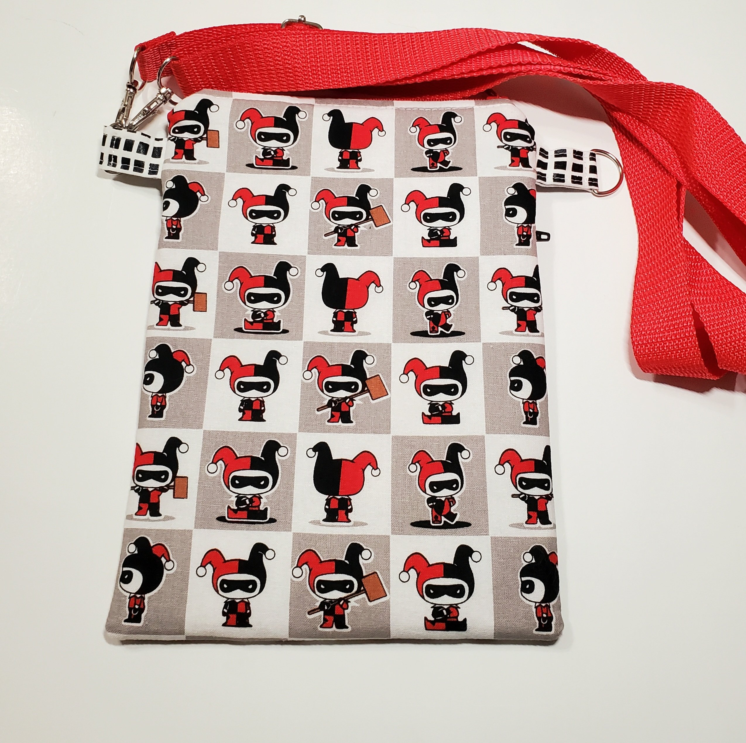 A perfect grab-n-go essentials bag with everyone's favorite mouthy villainess. A split color lining celebrates Harley's iconic red & black color scheme. Take this little monster queen with you wherever you go! Measures 9.5"x6.5" with two zippered compartments. Adjustable strap expands to 60" and can also be swapped out via the swivel hook attachments. Fully lined. One of a kind.