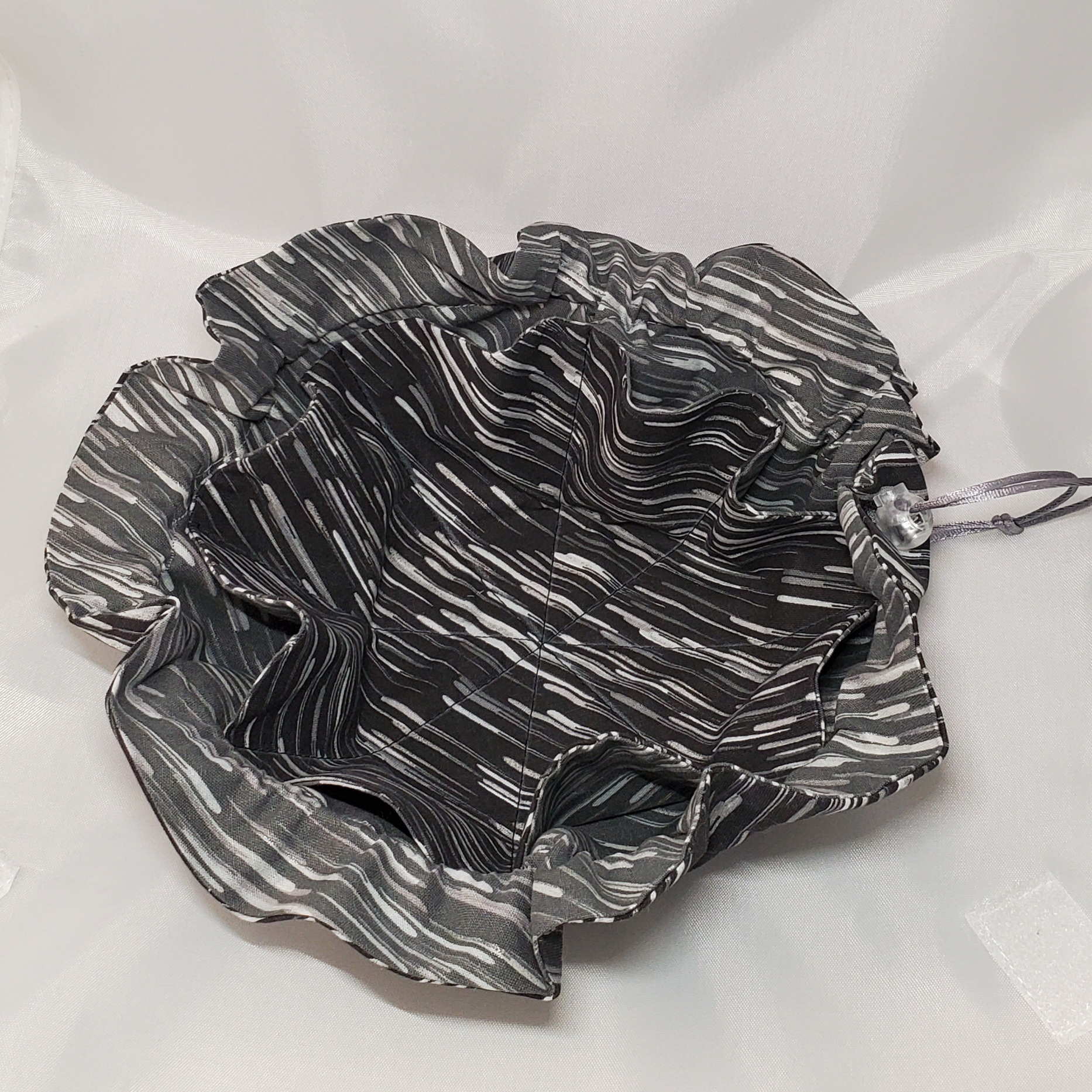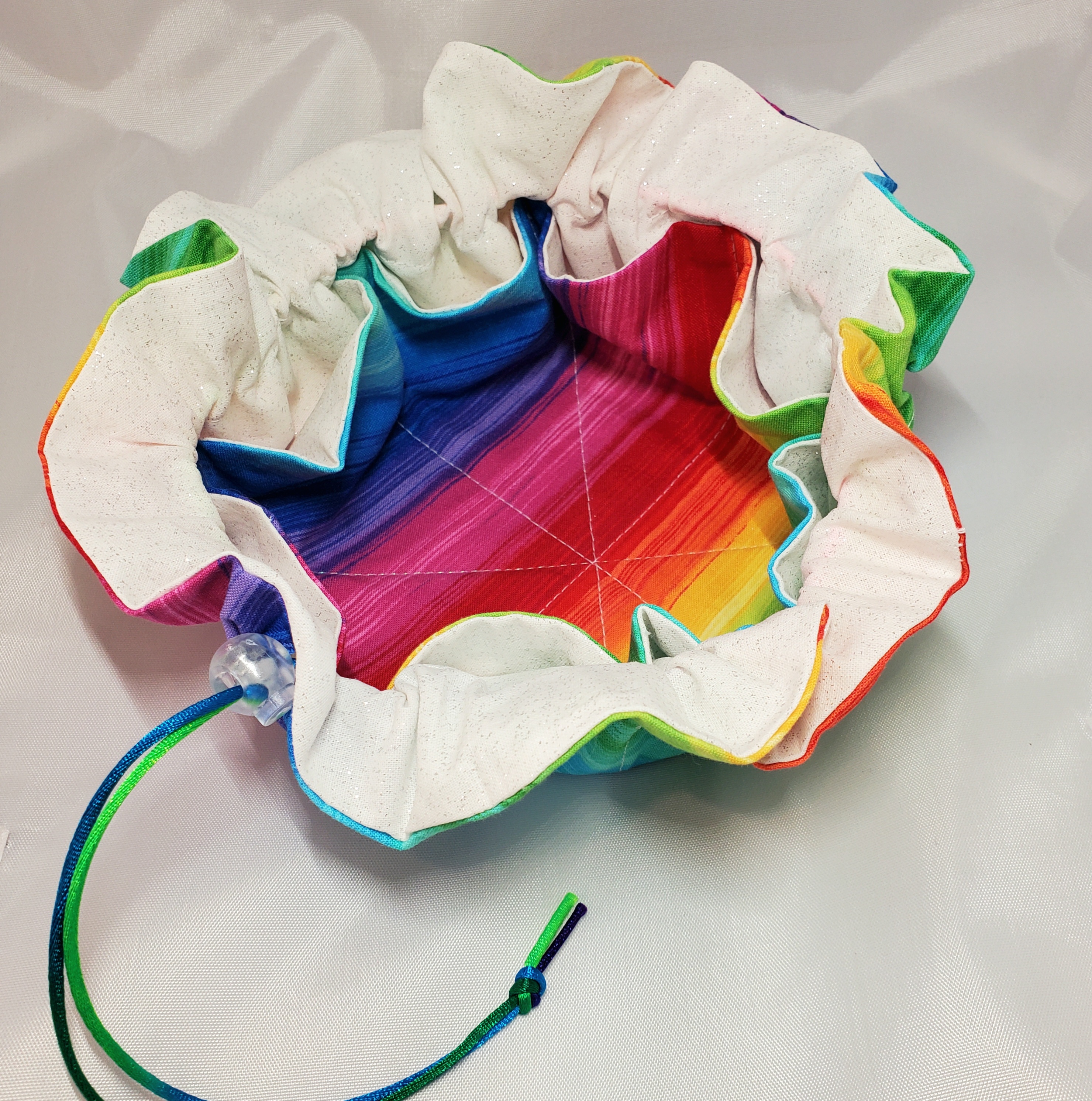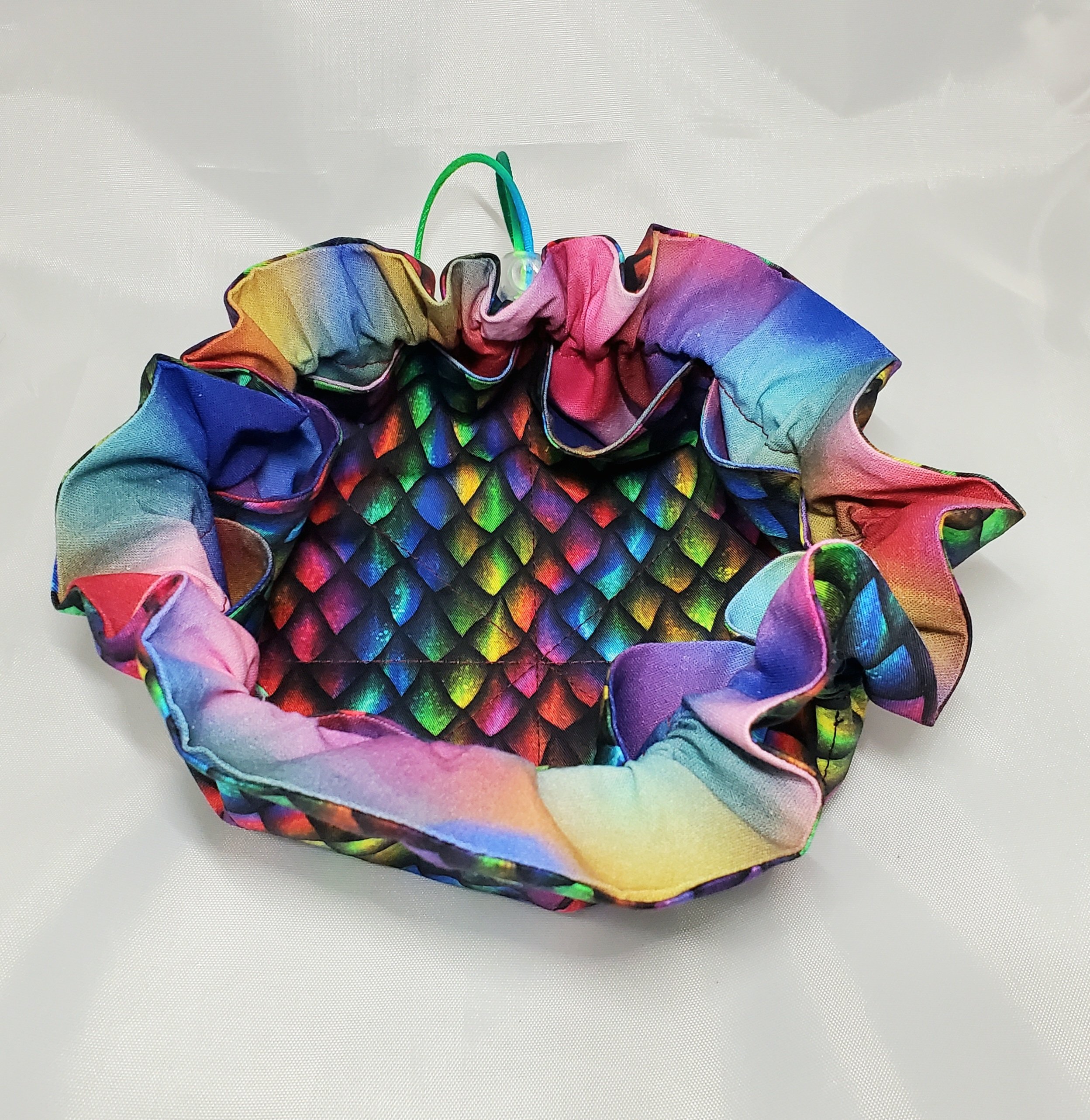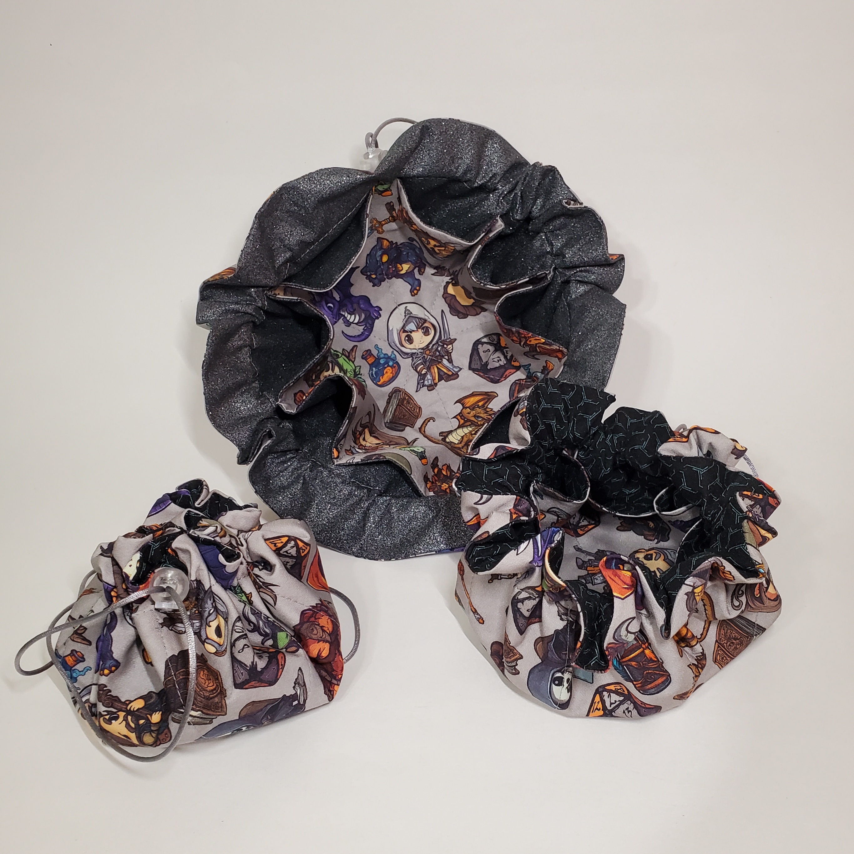 A drawstring dice pouch with 8 separate pockets to hold all your dice sets, gaming pieces and other paraphernalia. It is lightly lined for structure which also means you can use it as a small dice tray when opened up! A silky cord and matching cord lock cinches tight to keep the bag securely closed. Can also be used as a travel jewelry bag, or for gems and stones. Approximately 12 inches when opened flat. Available with a variety of prints; please select your preference from the drop down menu.