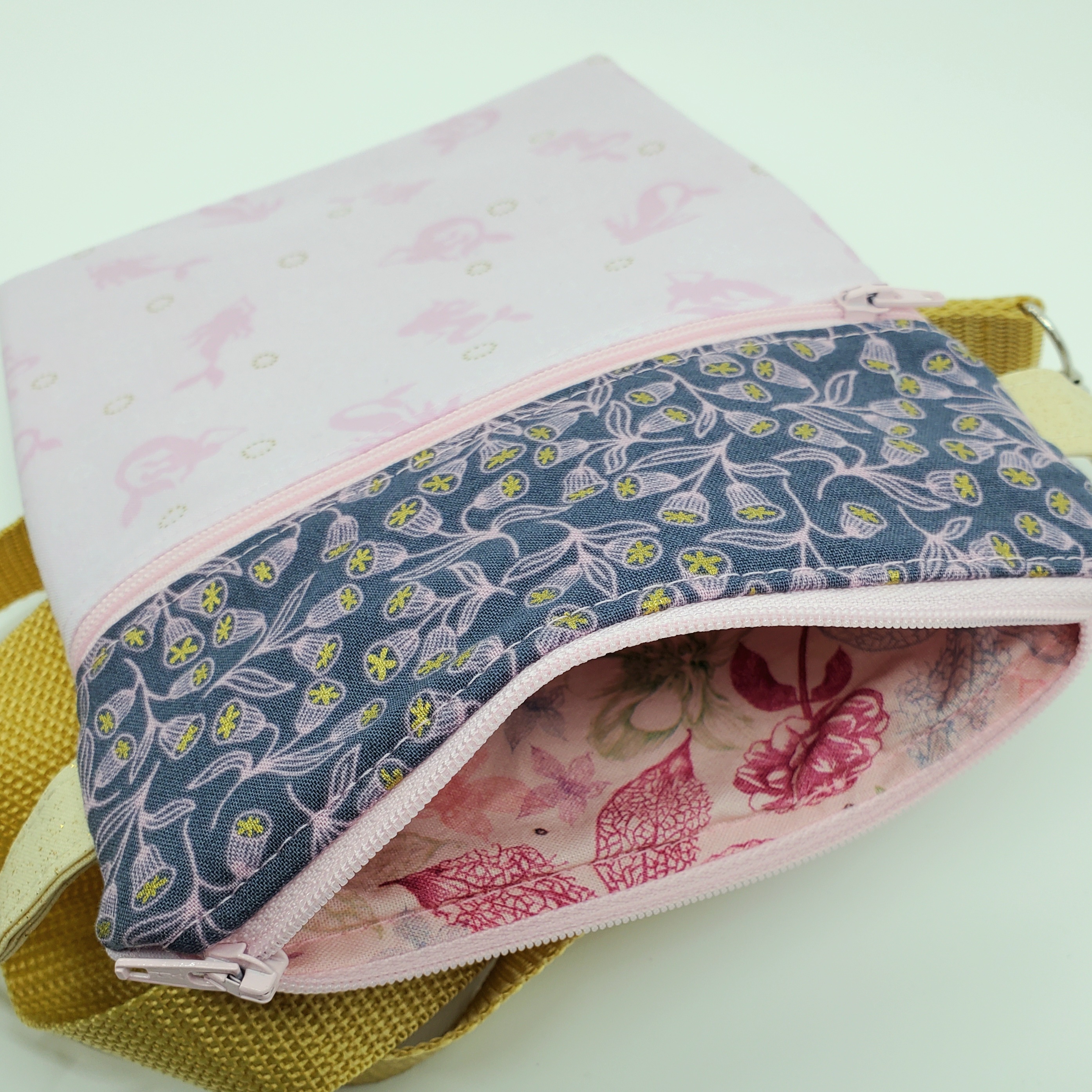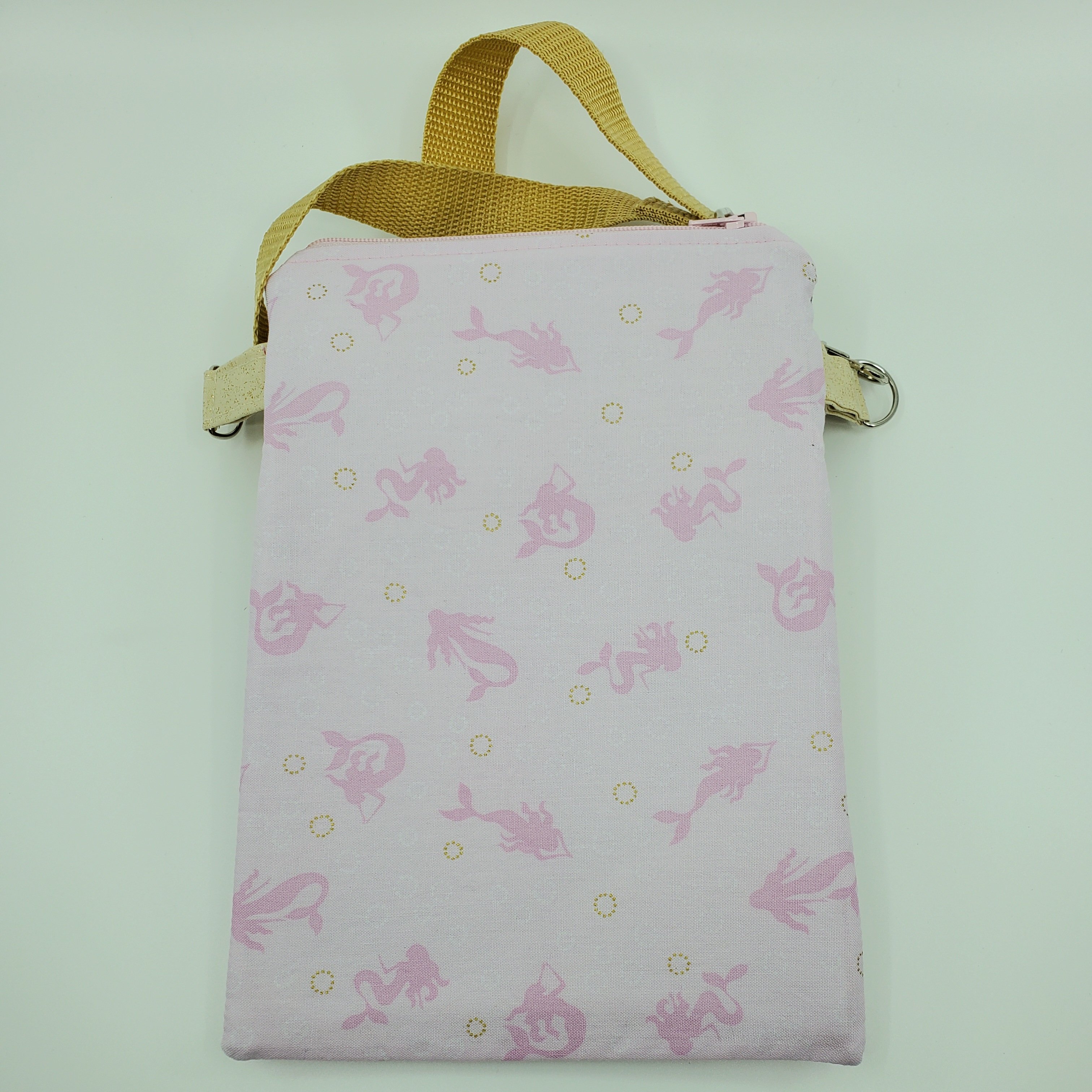 A perfect grab-n-go essentials bag! Measures 9.5"x6.5" with two zippered compartments. An understated print of pink mermaids, sea flowers, and gold metallic accents make this pretty bag extra magical. Adjustable strap expands to approximately 60" and can also be swapped out via the swivel hook attachments. Fully lined.