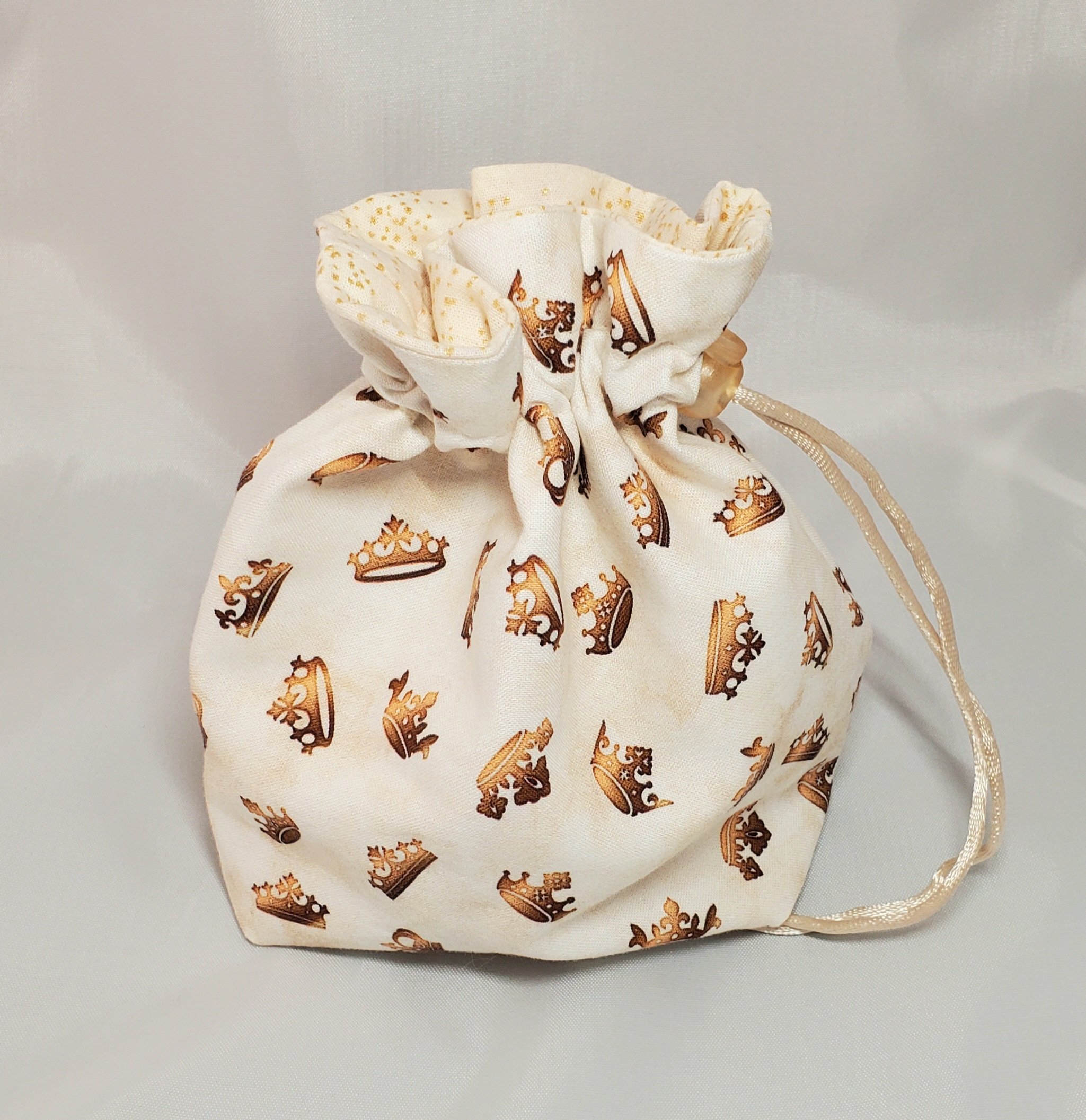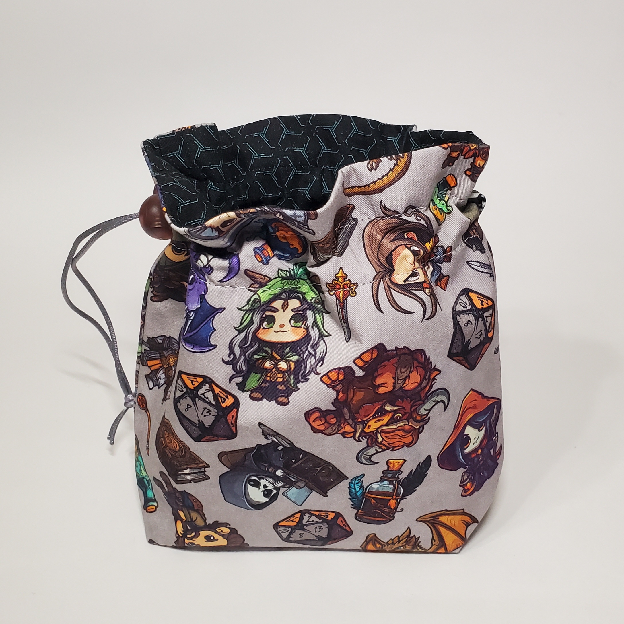 These cinch-drawstring bags are great for your dice, but also any other smaller travel items, snack, or trinkets needed on the go. Smaller than the other drawstrings on the shop, but larger than the pocketed versions. Measures approximately 7"Hx5"Wx3"D when standing. Select your style from the drop down menu.