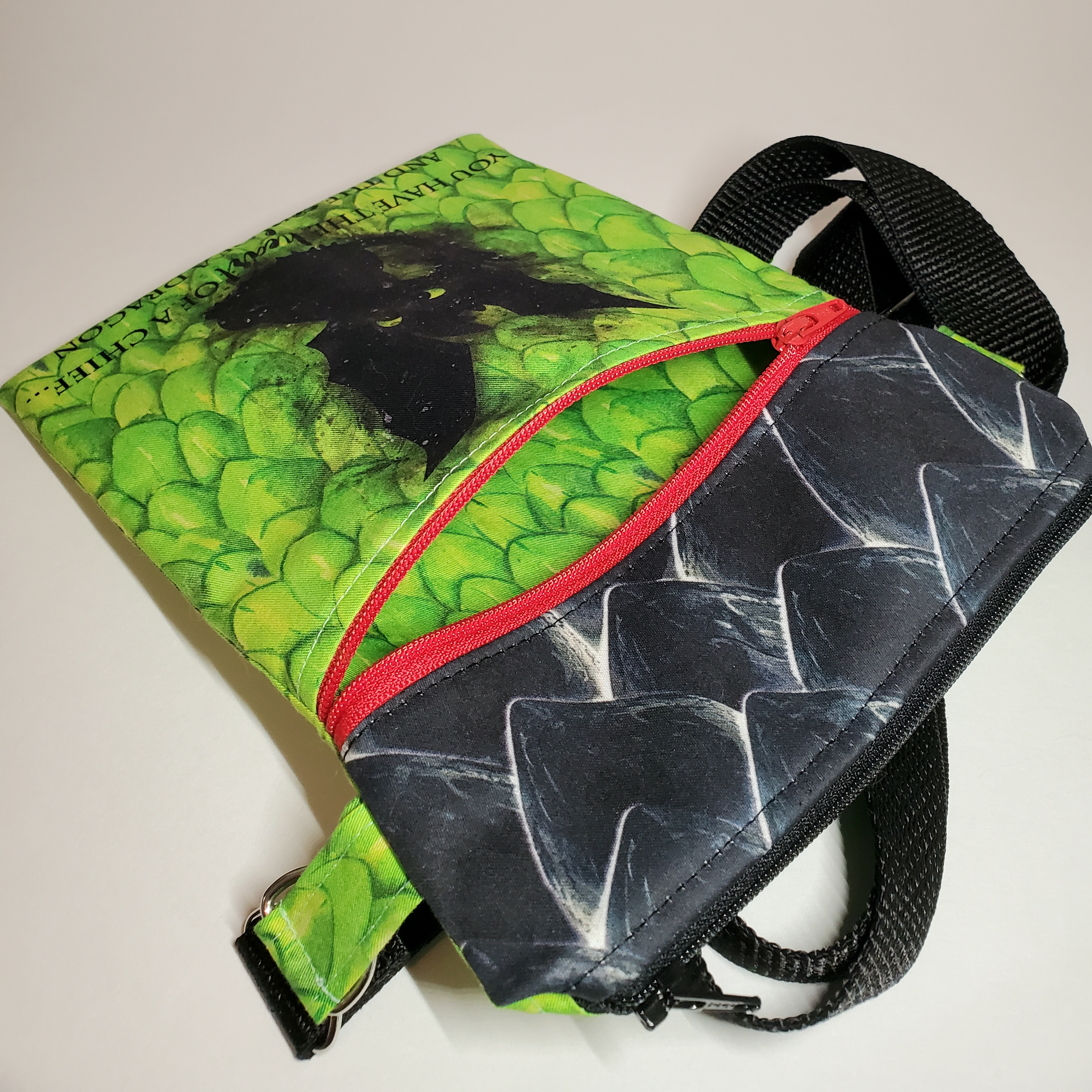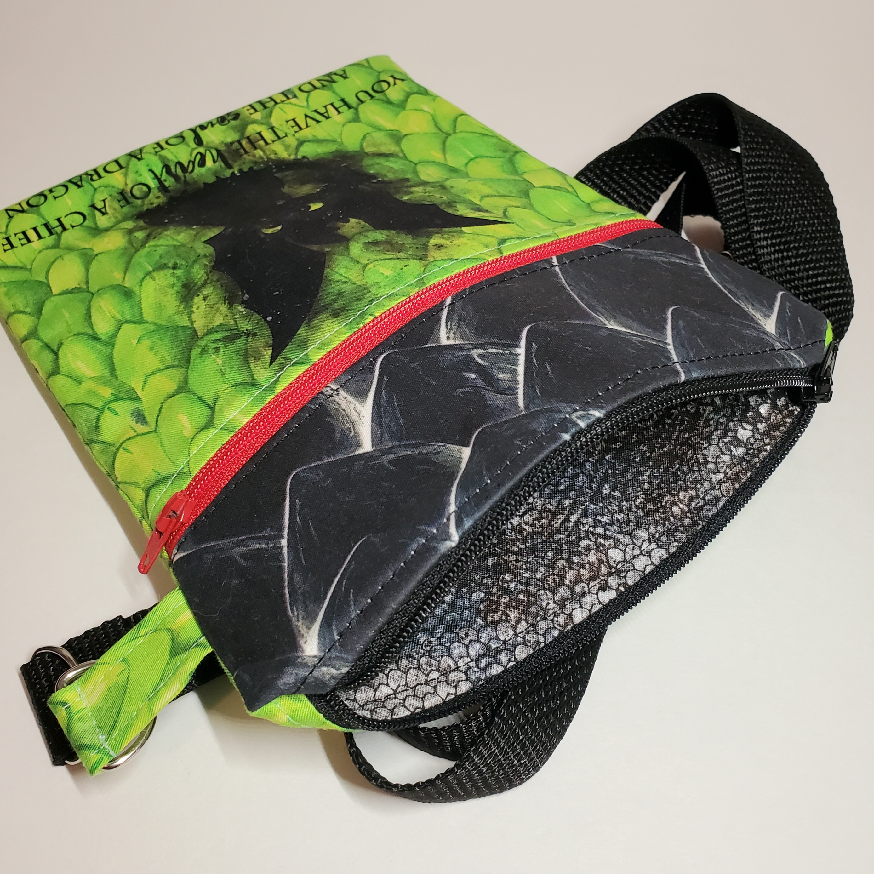 A Toothless/How to Train Your Dragon-inspired crossbody bag, featuring a sweet front panel print that is suitable for a budding trainers and old hands alike! A perfect grab-n-go essentials bag size, it measures 9.5"x6.5" with two zippered compartments. Adjustable strap expands to approximately 60" and can also be swapped out via the swivel hook attachments. Fully lined. One of a kind.