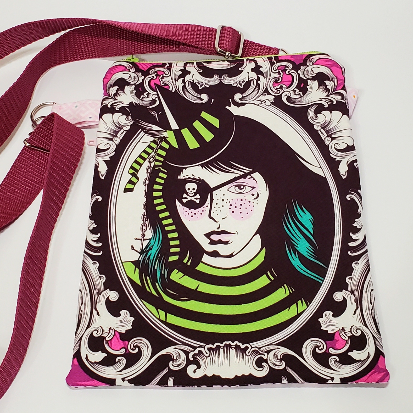 A bag with striking colors and striking character! The perfect grab-n-go essentials bag! Measures 9.5"x6.5" with two zippered compartments. Adjustable strap expands to 60" and can also be swapped out via the swivel hook attachments. Fully lined. One-of-a-kind.