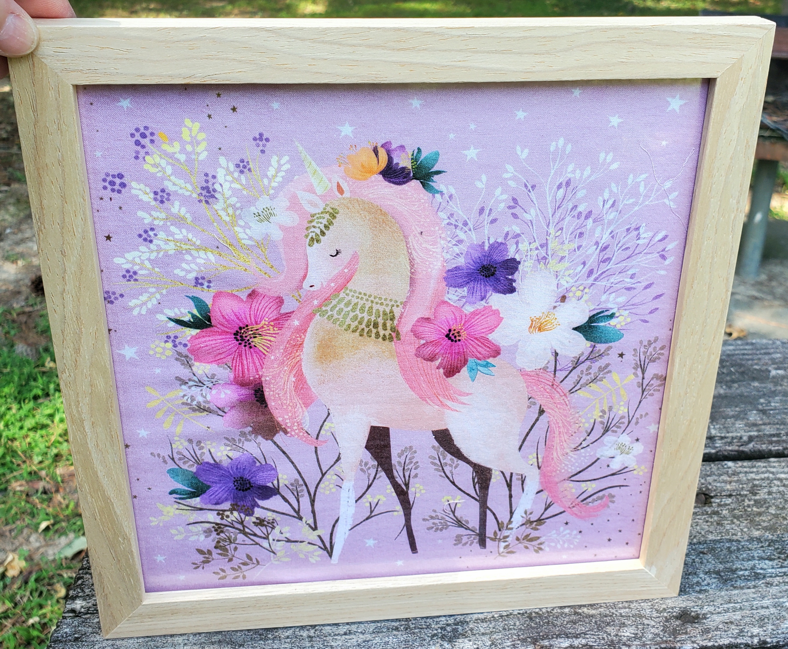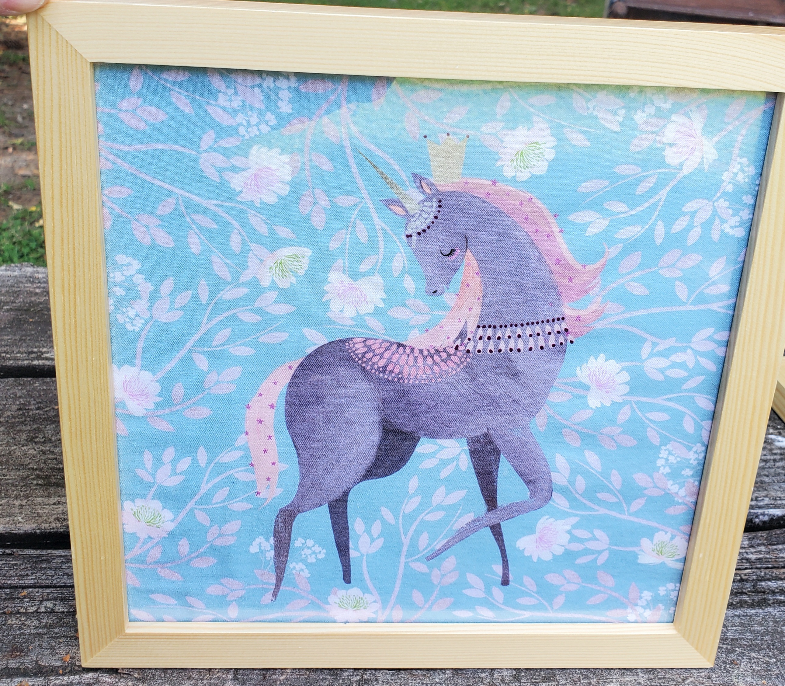 Add some magical whimsy to your decor with these gorgeously-illustrated unicorn pieces. Each one is a unique, one of a kind piece of fabric art. Comes in an 8"x8" natural wood frame that can be used as is or painted/decorated as desired. Plexiglass window.