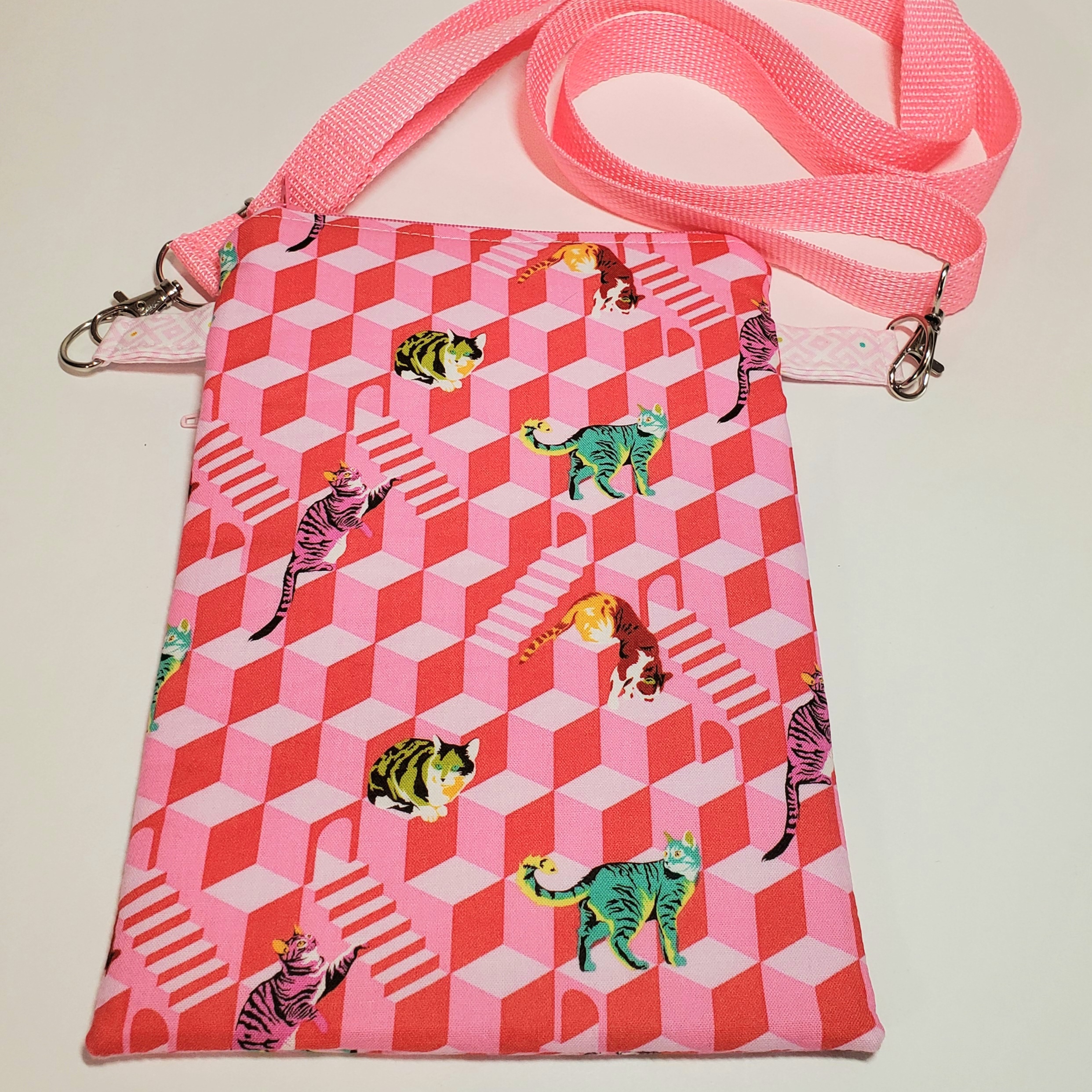 Bright, bold colors accompany the tabby cats on this attention-grabbing grab-n-go essentials bag! Measures 9.5"x6.5" with two zippered compartments. Adjustable strap expands to 60" and can also be swapped out via the swivel hook attachments. Fully lined.