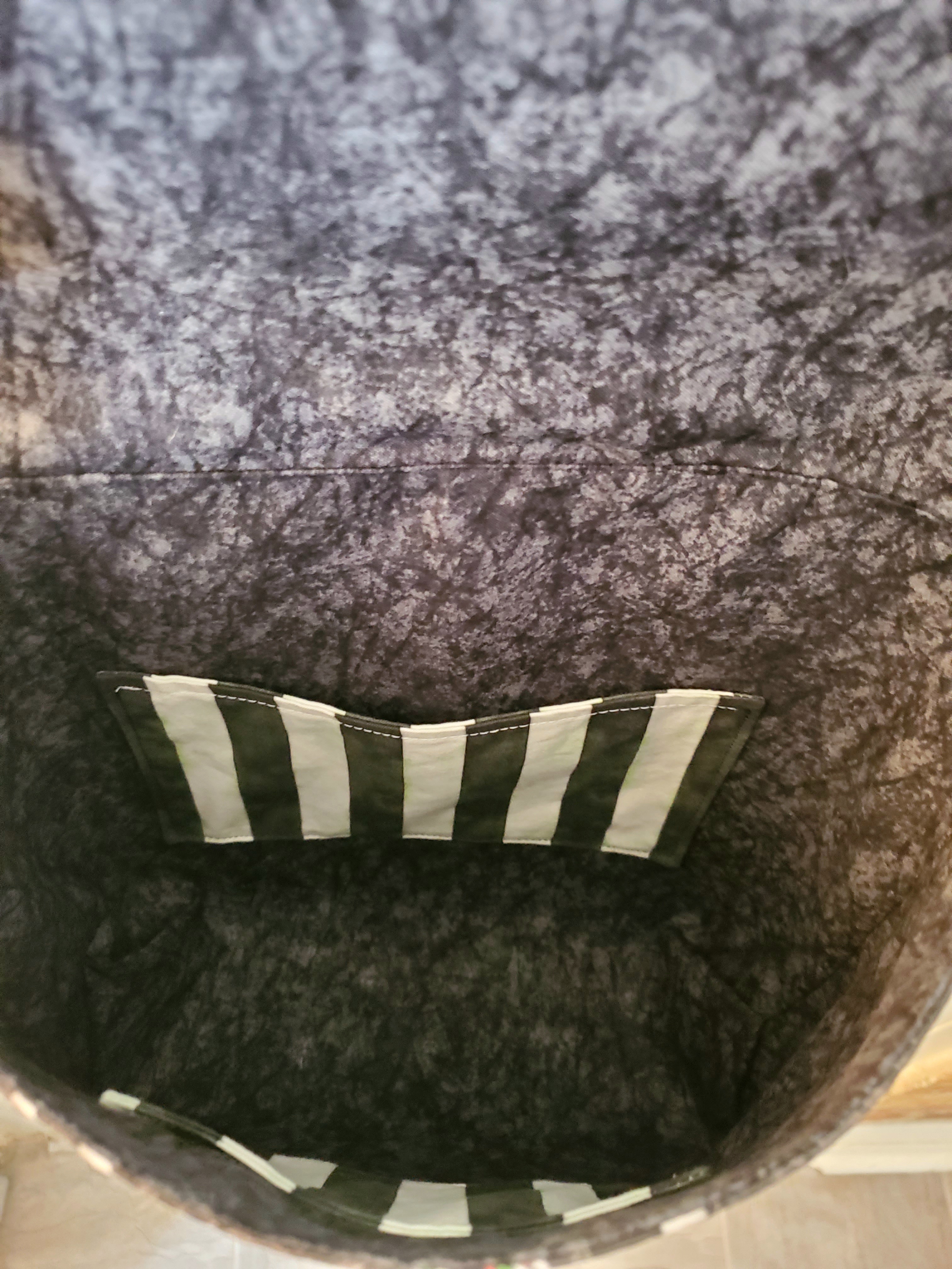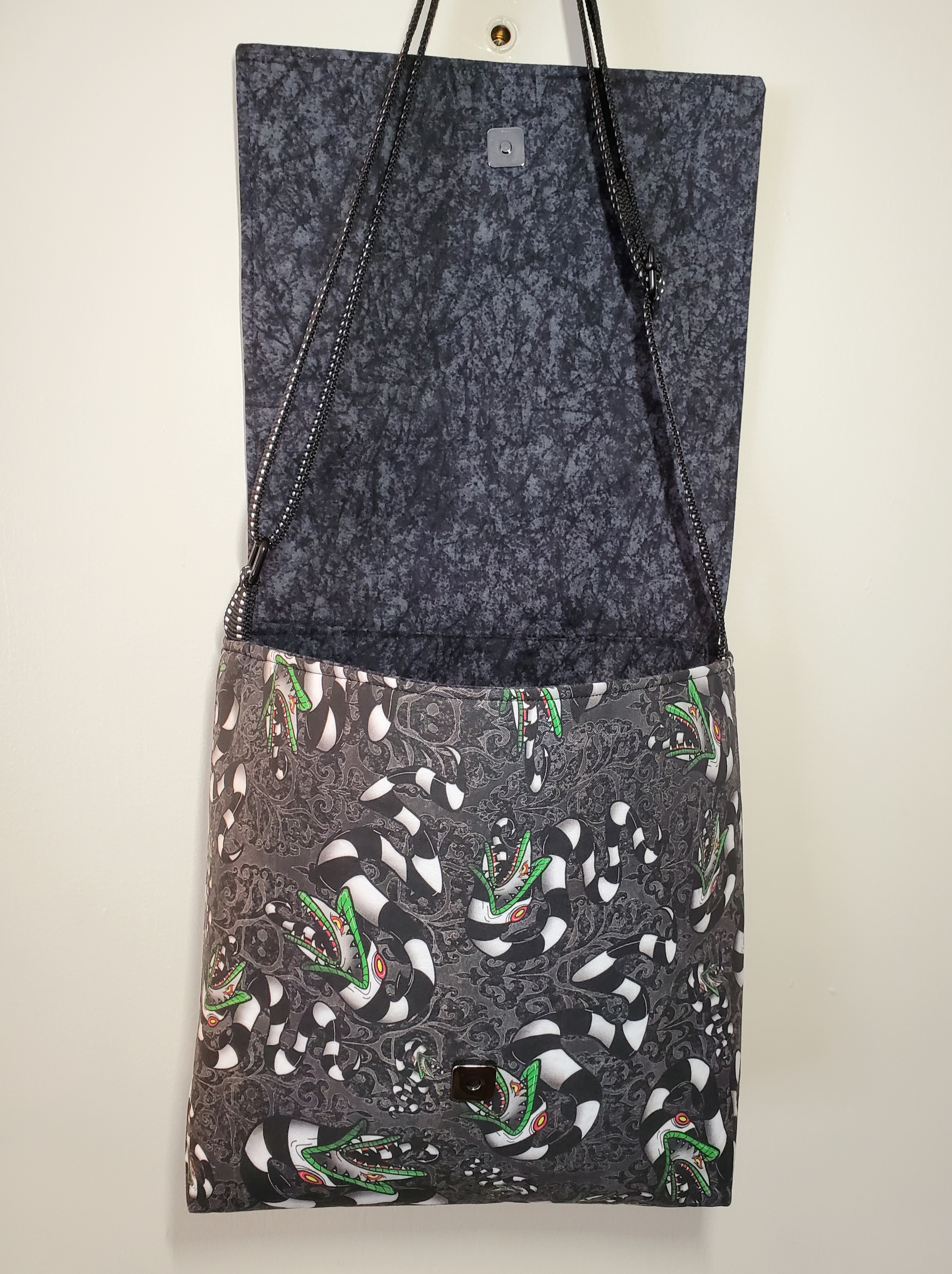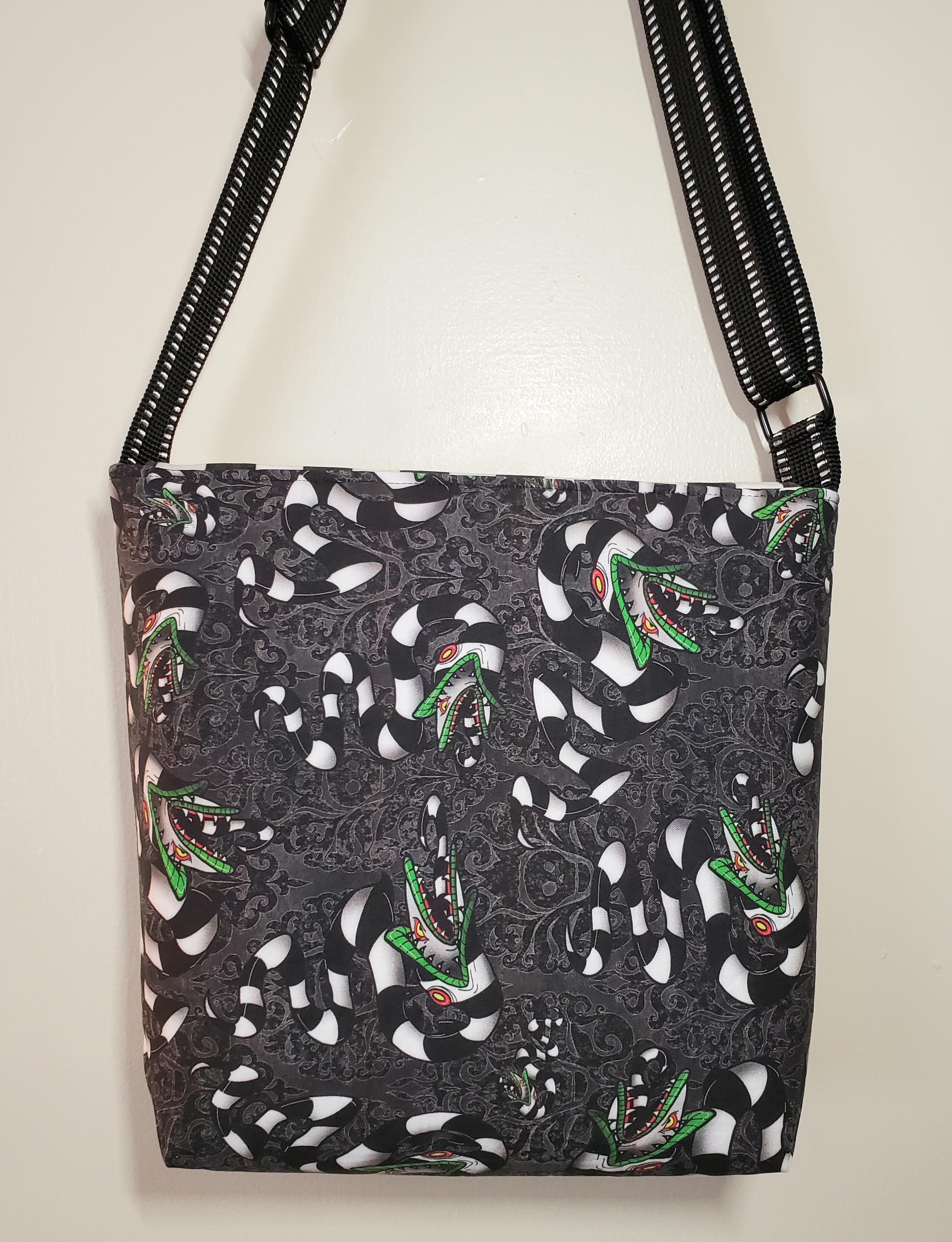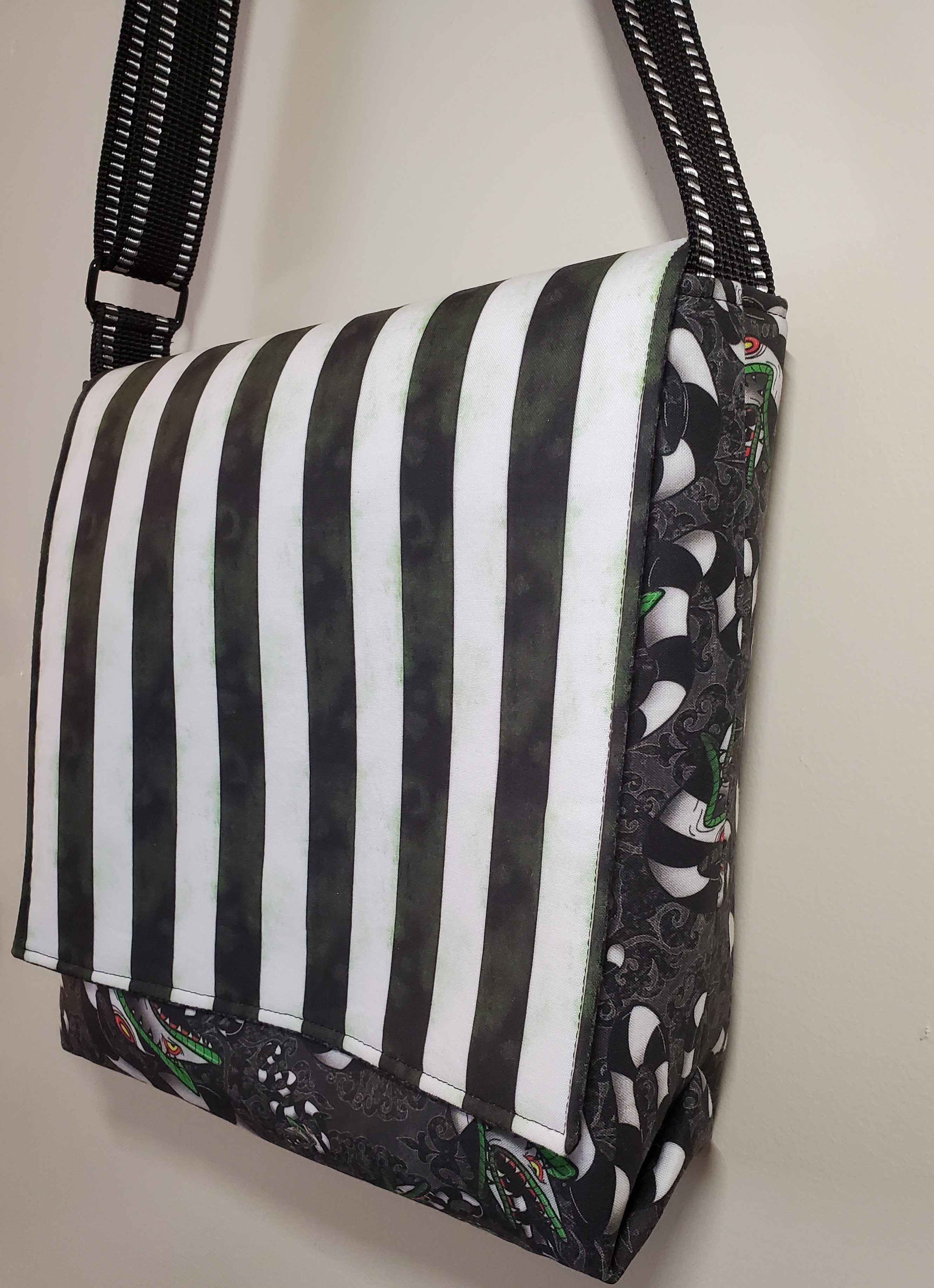 This Beetlejuice-inspired messenger bag will turn heads as you travel through the underworld! Features a bold sandworm print for the body and a black & white stripe suit for the flap (complete with moldy green splotches). This basic messenger bag is fully lined, has two interior slip pockets, a magnetic snap closure, and adjustable-length strap. Measures approximately 11x10x3.5". Only one available.