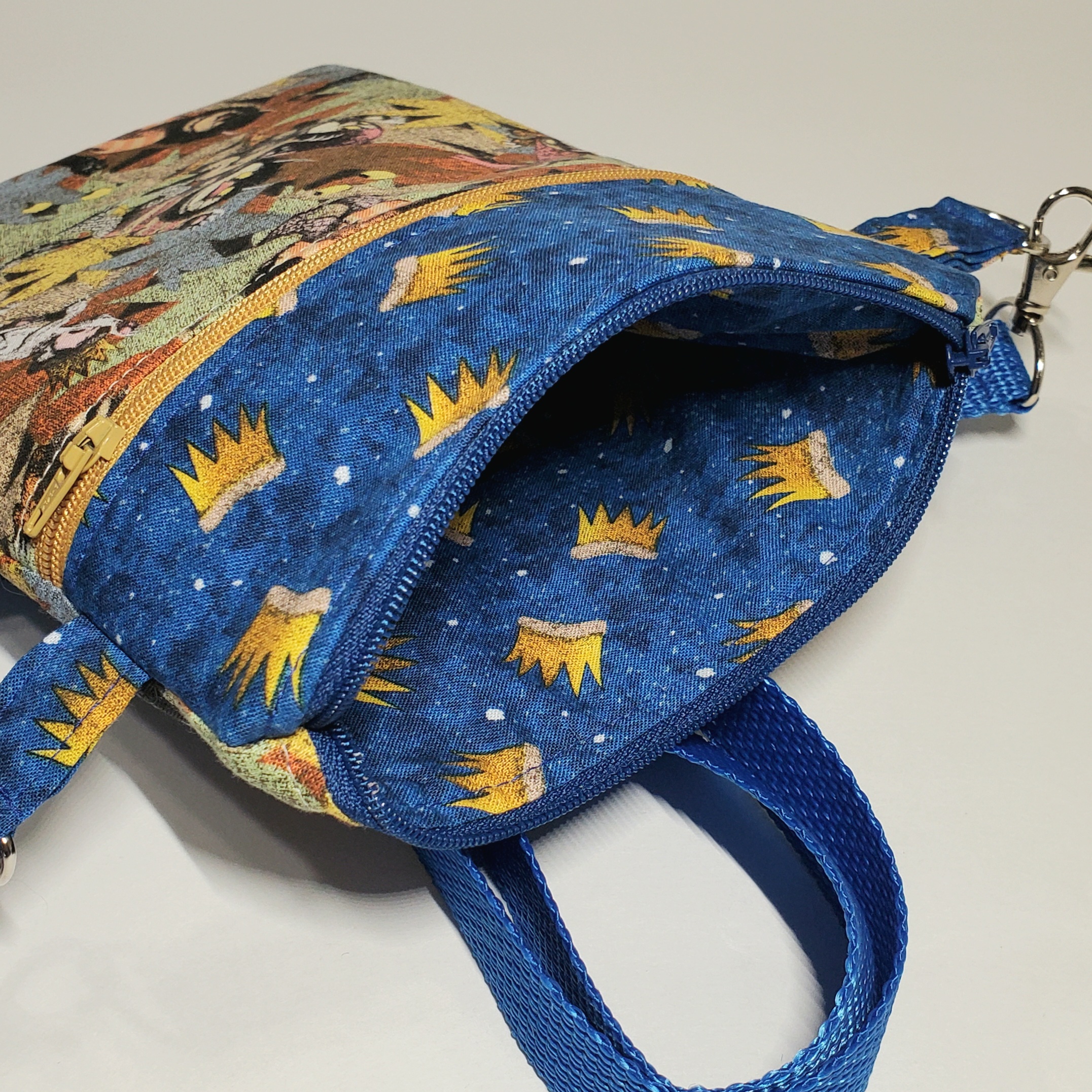 For the kid (or kid in all of us), this vintage storybook classic Where the Wild Things Are bag is perfect for grab-n-go essentials! Measures 9.5"x6.5" with two zippered compartments. Adjustable strap expands to 60" and can also be swapped out via the swivel hook attachments. Fully lined. One-of-a-kind.