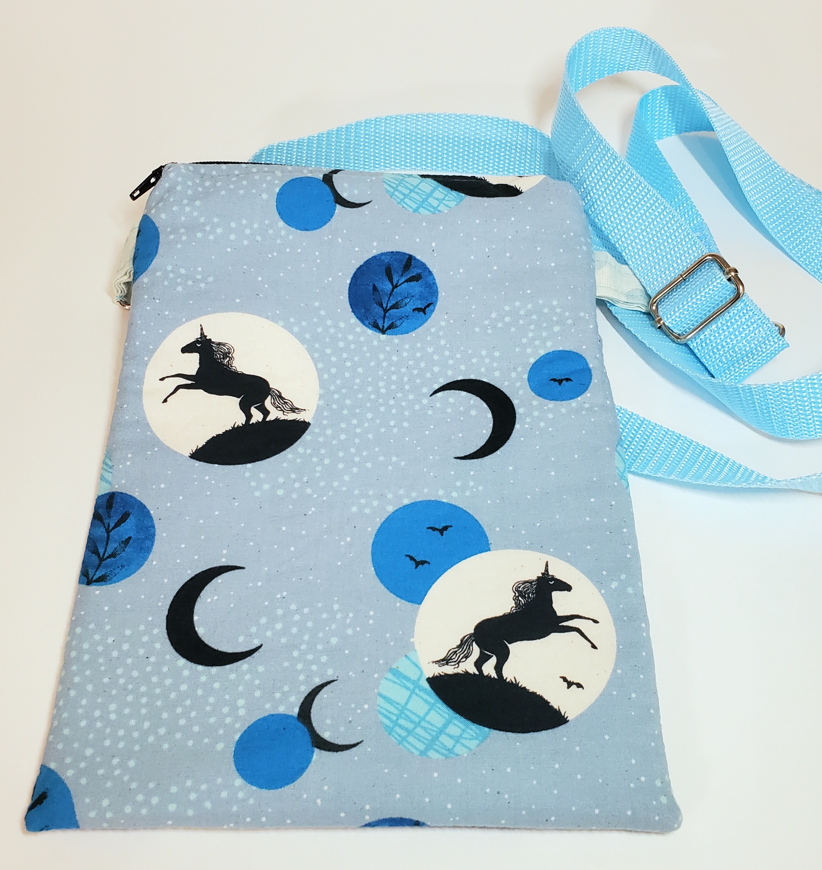 Unicorns, moons, and bats - a little bit spooky, all magical! This perfect grab-n-go essentials bag measures 9.5"x6.5" with two zippered compartments. Adjustable strap expands to 60" and can also be swapped out via the swivel hook attachments. Fully lined.