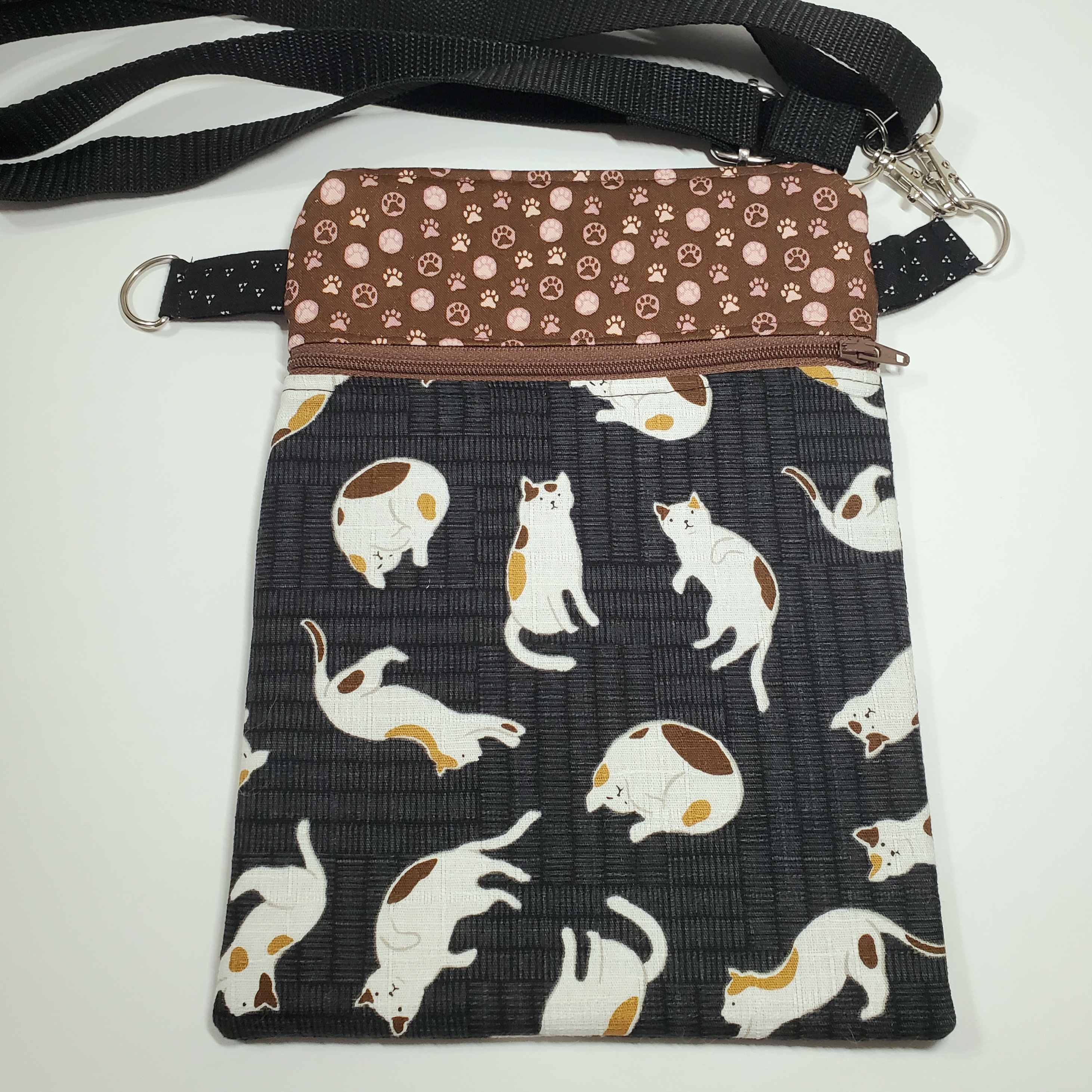Cute calico kitties roll around on this perfect grab-n-go essentials bag! Measures 9.5"x6.5" with two zippered compartments. Made with imported Japanese fabric. Adjustable strap expands to 60" and can also be swapped out via the swivel hook attachments. Fully lined.