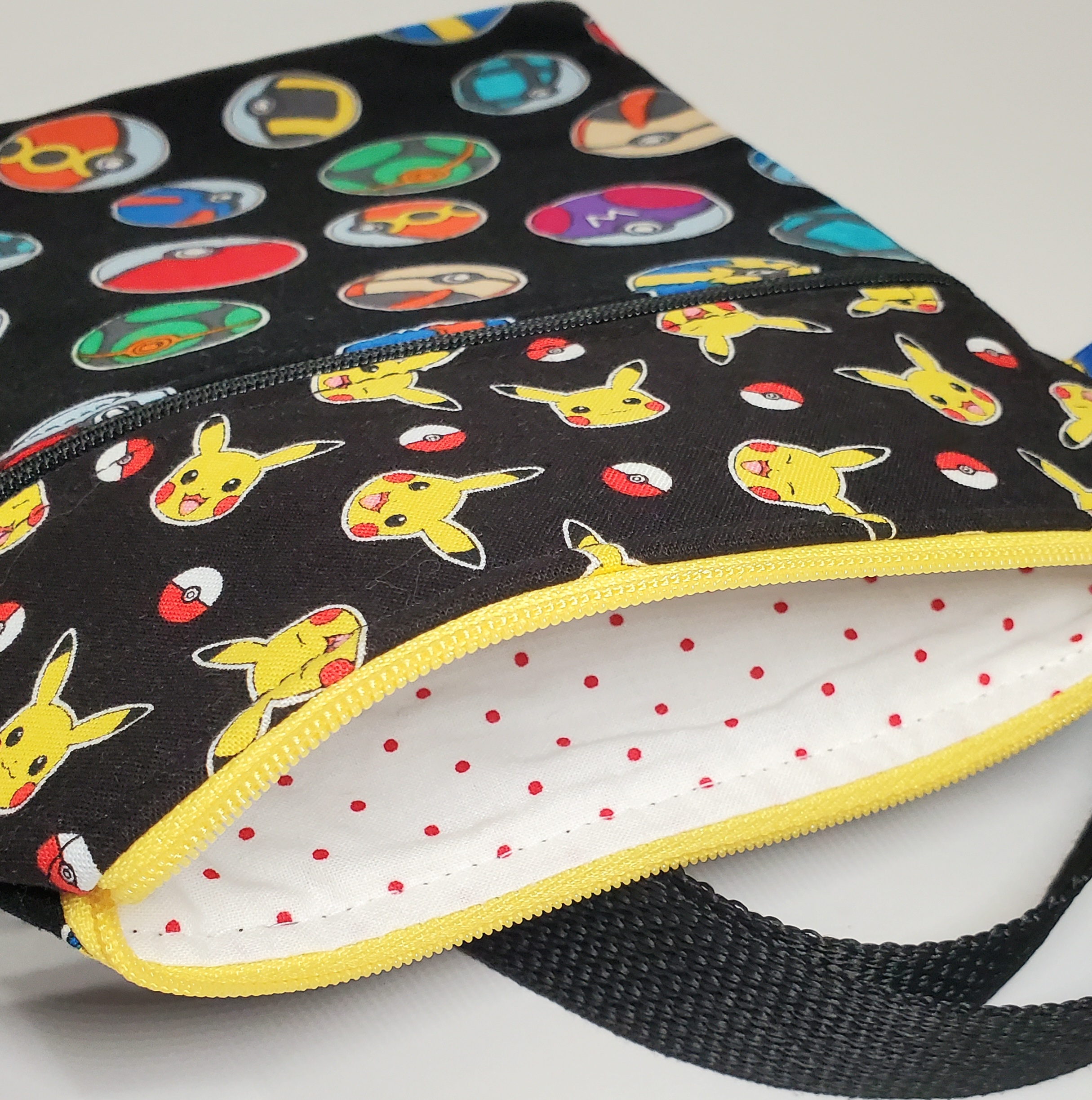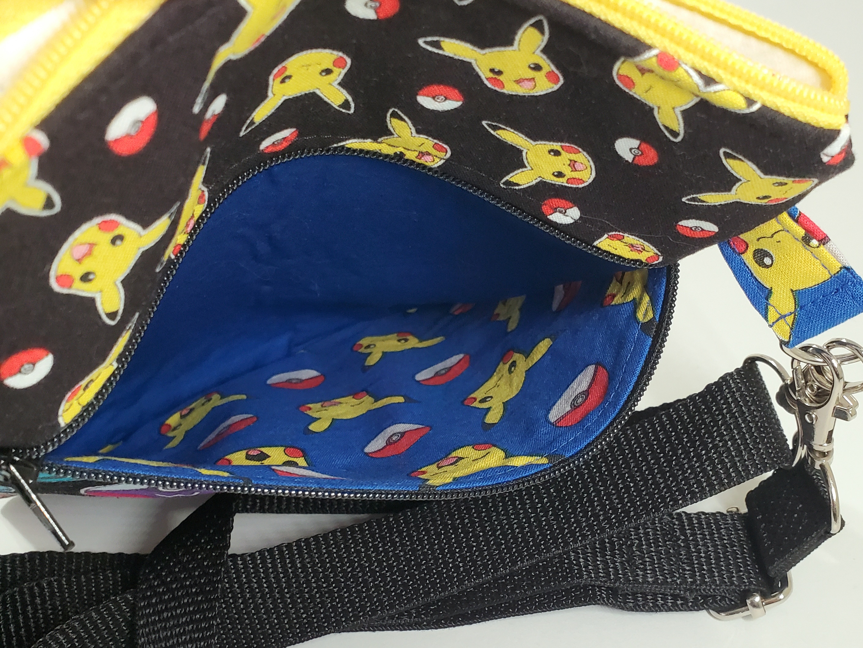A perfect for grab-n-go essentials bag for when you're out hunting pokemon! Measures 9.5"x6.5" with two zippered compartments. Adjustable strap expands to 60" and can also be swapped out via the swivel hook attachments. Fully lined. One-of-a-kind. Features a peek-a-boo vintage retro blue Pikachu fabric!