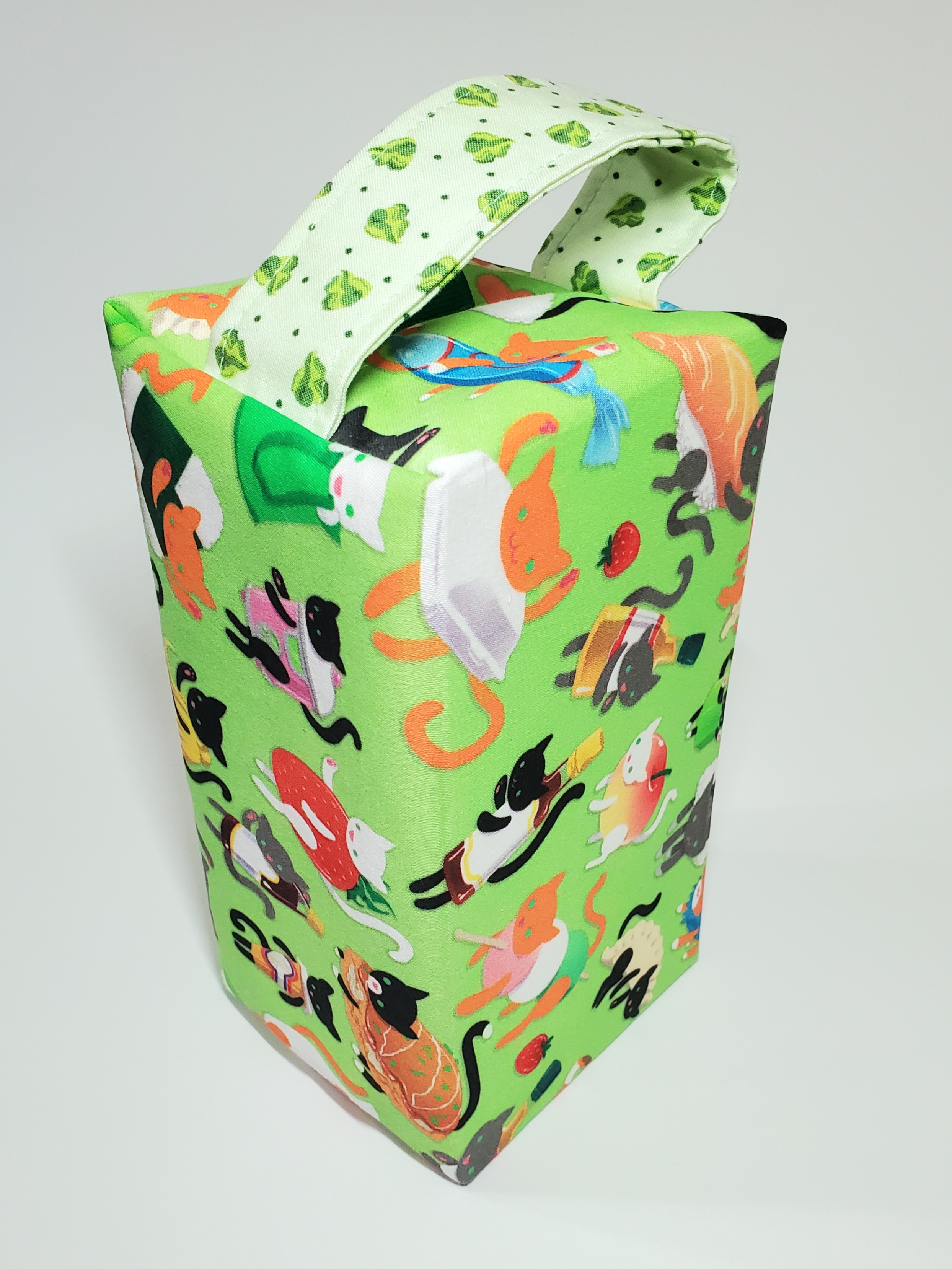 Who doesn't need a bag covered in cats-as-Japanese food stuffs, nya? Made with organic cotton and measuring a roomy 8"x4"x4", this large box bag is great for toiletries, craft supplies, gadgets, cosmetics, or use as a project bag!